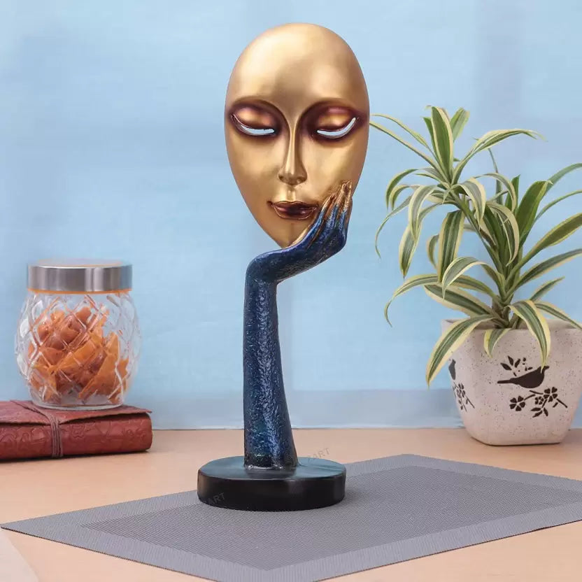 Face Showpiece is a captivating and unique piece of art that celebrates the human visage in a creatively sculpted form.Face Showpiece is a captivating and unique piece of art that celebrates the human visage in a creatively sculpted form. Materials: The statue is meticulously constructed using premium materials, such as polyresin & marble dust, ensuring a durable and lustrous finish that will stand the test of time. The choice of materials enhances the overall contemporary appeal, making it a perfect addition to both modern and eclectic interior designs.Design: The design of the face showpiece statue is a harmonious blend of abstract and realistic elements. The artist skillfully captures the essence of human facial features while adding a touch of artistic interpretation. The facial lines and contours are smooth and fluid, creating a sense of elegance and grace.Expression: The statue's facial expression is enigmatic, leaving room for individual interpretation and contemplation. It might convey a myriad of emotions like serenity, mystery, or introspection, sparking curiosity and engaging viewers on a deeper level.Dimensions: The "Contemporary Elegance" Face Showpiece Statue comes in various sizes, ranging from a modest table-top version to an awe-inspiring, life-sized masterpiece, allowing you to choose the one that best complements your space.